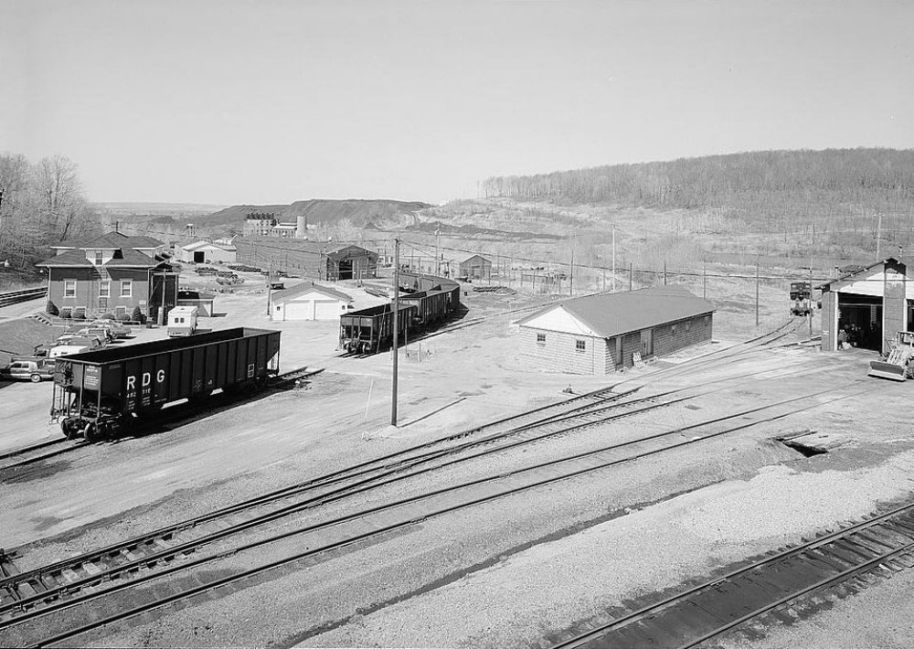 GENERAL VIEW OF RAILROAD YARD LOOKING NORTH. Office and Car and Wheel Shops to left, Engine House No. 1 to right. Ebensburg Processing Plant and Powerhouse (Colver Mine) in far left background.