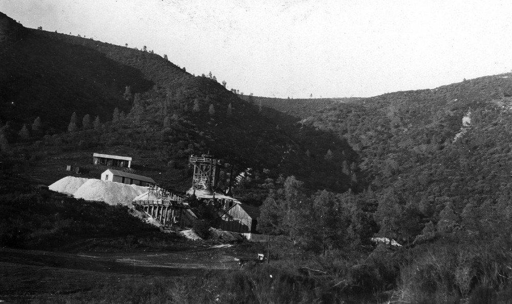 Western Magnesite Development Company, Red Mountain. Looking east shows 3000-ton stock pile, kilns, and terminal of aerial tram. Napa County, California. August 8, 1917.