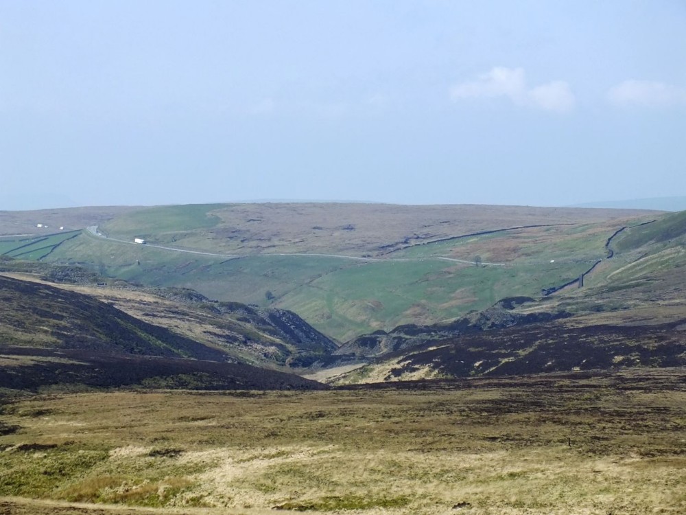 The Reeve Edge set of quarries is on the left and the Dane Bower set is on the right. The chimney for Dane Bower Colliery can also been seen. The photo is taken from Axe Edge looking west/southwest, a short distance south of Thatch Marsh Colliery