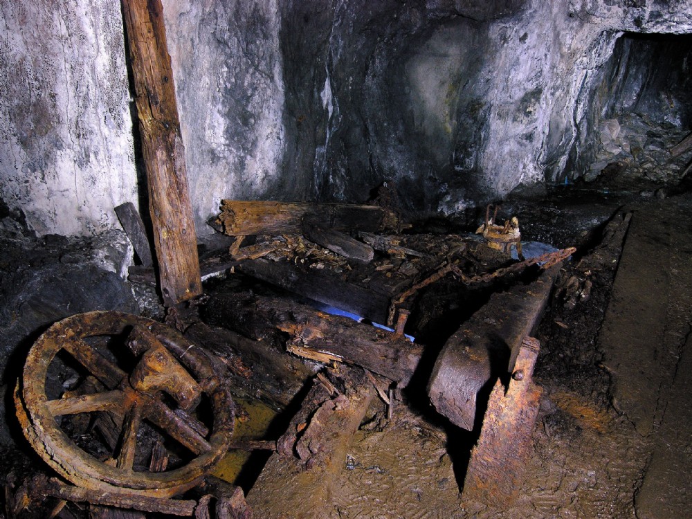 Various ruined machinery; I presume this is where a belt driven pump would have been mounted.