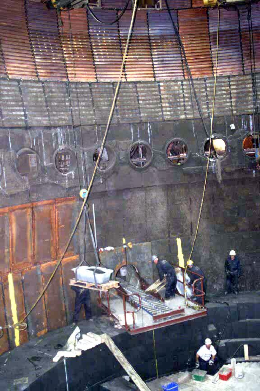 The hearth of the furness being lined with new bricks, converyer coming in through a tap-hole.