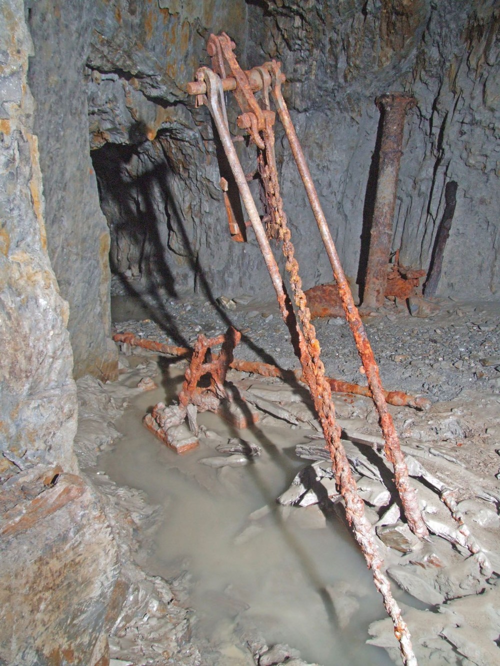 This is the remains of the pumping angle bob at eastern engine winze, actuated by about 500 yards of cast iron rods running through the adit from the waterwheel at the Wern