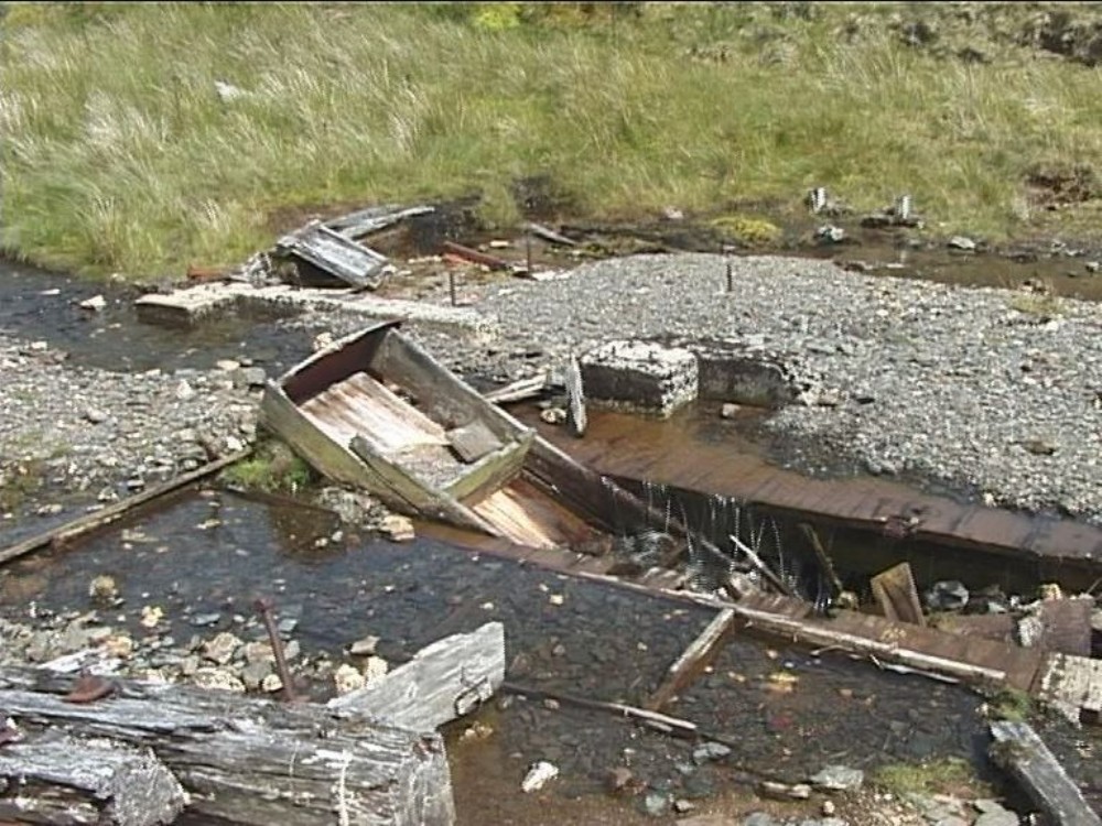Remains of the 4 compartment jigs at the c1900 water powered dressing floor. [Grab from 12th July 2002 video]
