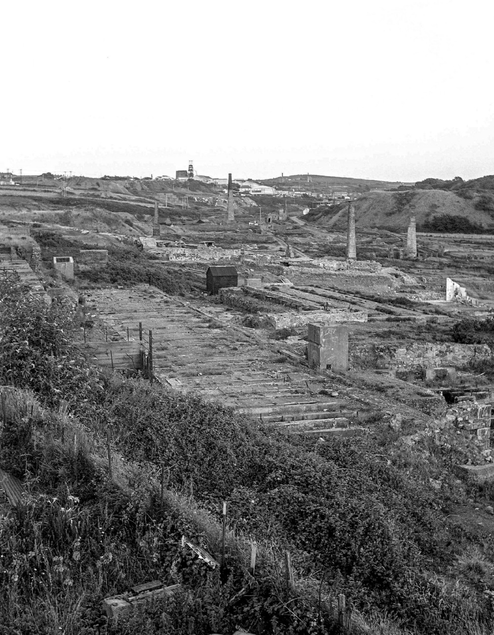 With the headframe of South Crofty on the skyline, the main flue from the arsenic works can be seen as a sloping structure in the left middle distance. This led to two large stacks, now long gone. See colour picture.