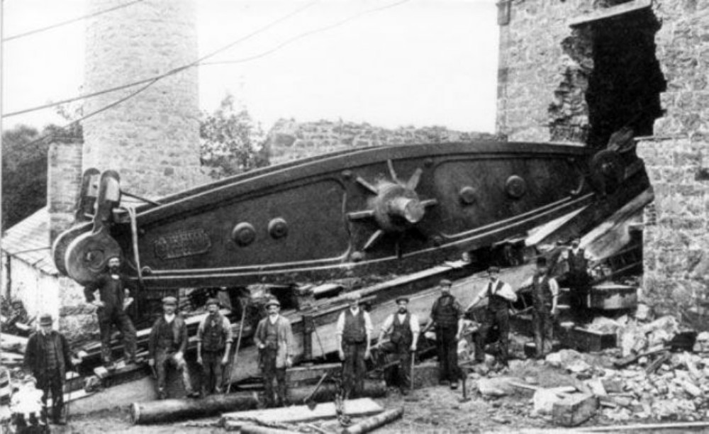 The 'bob' of the Cornish beam engine being removed from the engine house circa 1897.
