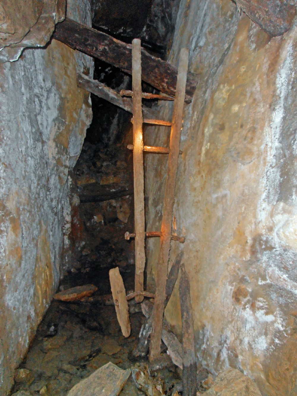 Old ladder just before collapse leading through to modern workings.