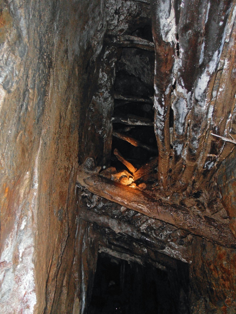 Following the Western drift, the extensive stope can be appiciated. The drift has a roof of deads piled on timbers (in foreground)