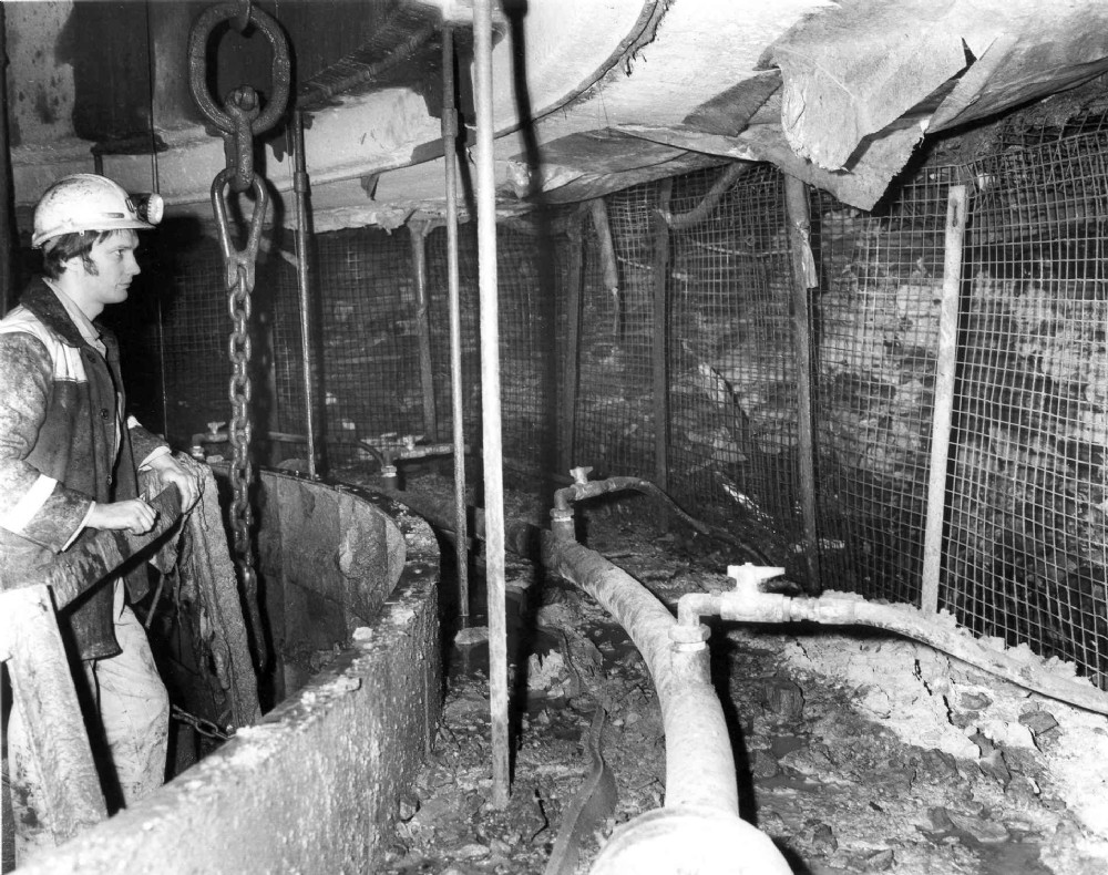 A very young looking undermanager casting his eye over the drainage system for the Wooley Edge Rock. I'm standing on the sinking stage, you can see the shutter still in place on the lining below the drainage ring. Backwall is meshed then approx 1m thick concrete lining. You can see the water seal sticking up out of the concrete just in front of the pipe ring.