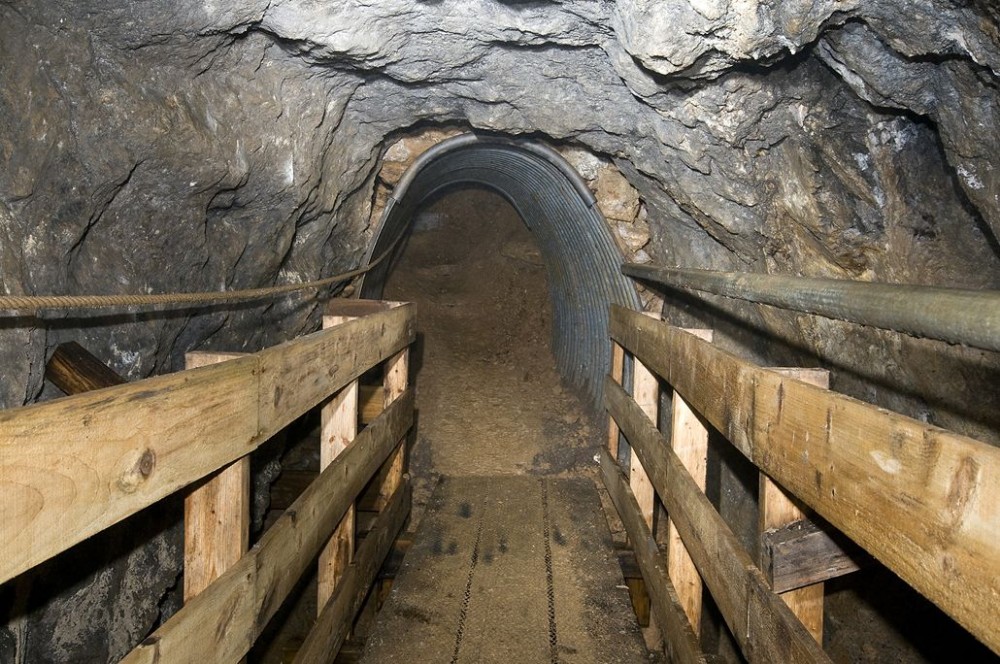 Outbye end of tube T4 (looking inbye over the wooden "Troll" bridge). The corrugated iron tube was built during the 1990s safety works by the Council, the wooden bridge was built more recently by the Shropshire Mines Trust to allow access for visitors to the bottom of the large stope.