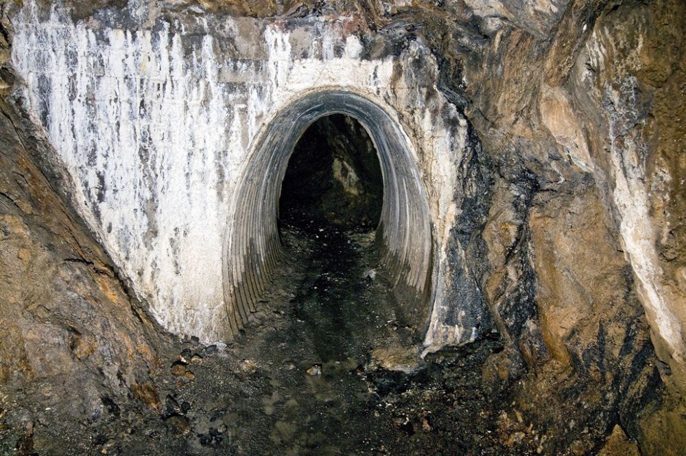 Outbye end of tube T2 (looking inbye). A series of these corrugated iron tubes surrounded by concrete were installed during the 1990s safety work. This one (the second tube) and tube T1 were built through an historic roof-fall that effectively closed this part of the mine.