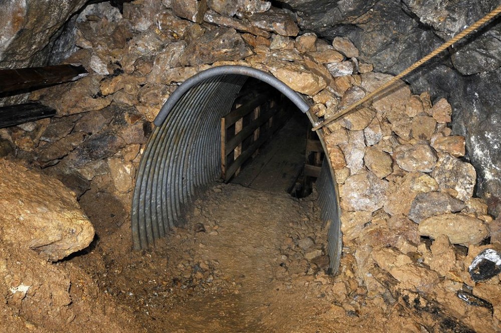 Inbye end of tube T4 (looking outbye). Corrugated iron tube surrounded by concrete in Robert's or Perkin's level. Built during the 1990s safety works, it allows access for visitors to the bottom of the large stope.