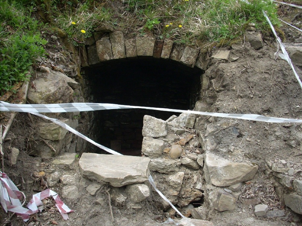This was originally a rocker pit, which we know from some wear grooves on the wall. It was roofed over and the right-hand buttress built, apparently for use as a pigsty, after the mine was abandoned in the 1880s when the shaft ran in. Thanks to AR for descriptions. Photo taken of excavations. Photo taken 24 April 2009