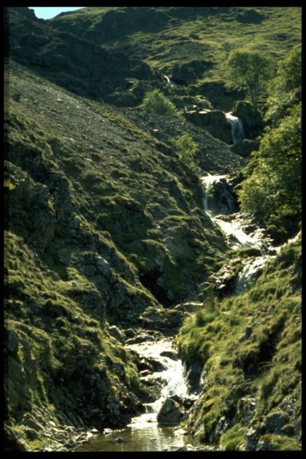 Looking up RG. Lowest horizontal level is on LH side of stream about 1/3 way up the photo. Photo taken about 1974.