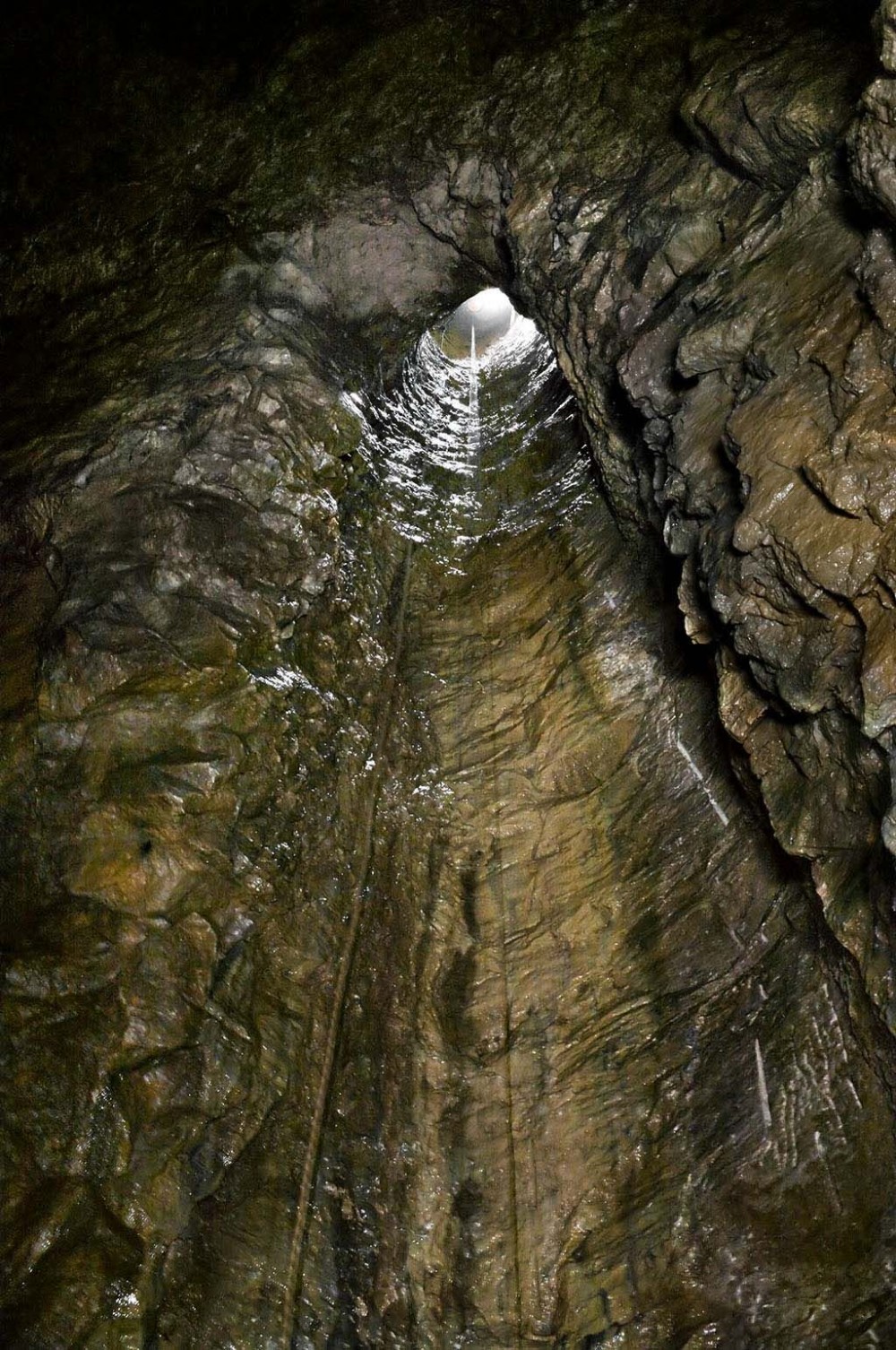 Entering the main chamber of the mine at -52m down the shaft. The total depth of the entrance is 69m.