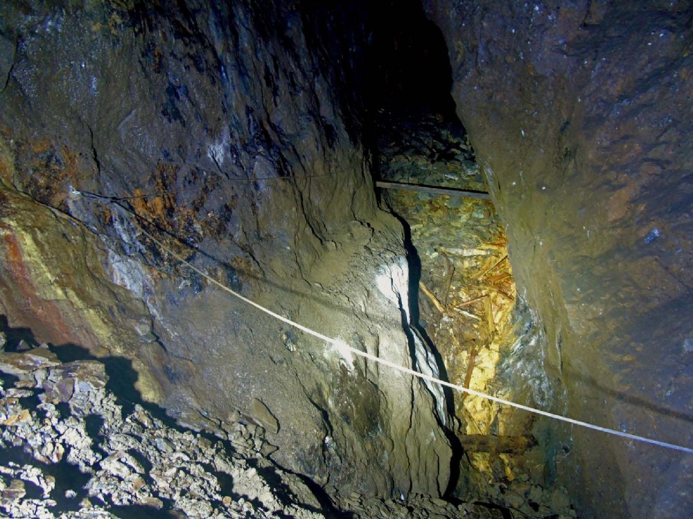 Traverse line fitted to reach the back. Explorers will go along the ledge and cowstails required. Beware a collapse into lower working at the very back. There is also a short blind exploratory level, so this and other factors indicate it to be the 10 fathom level.
