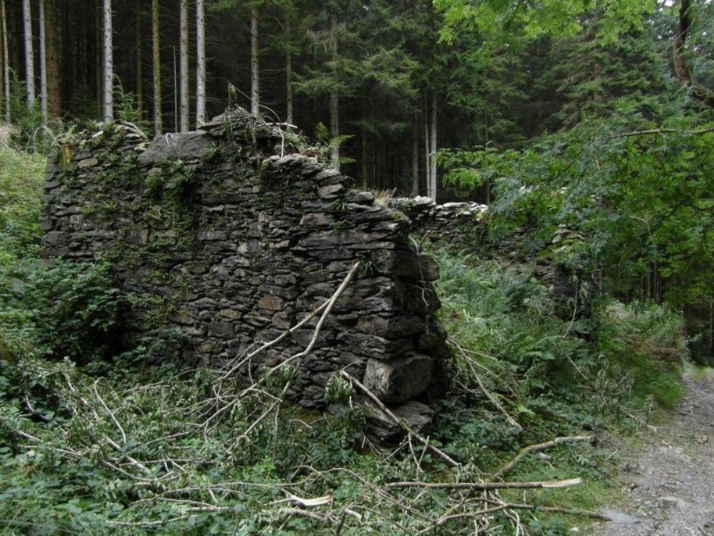 A ruined building at the siode of the incline, near the bottom. A forge? Stables?