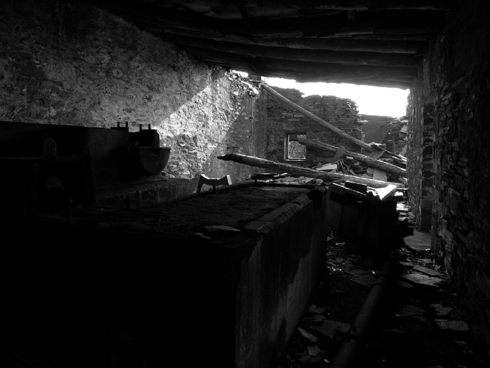 The roof has caved in on this building exposing the ruined machinery to the elements.