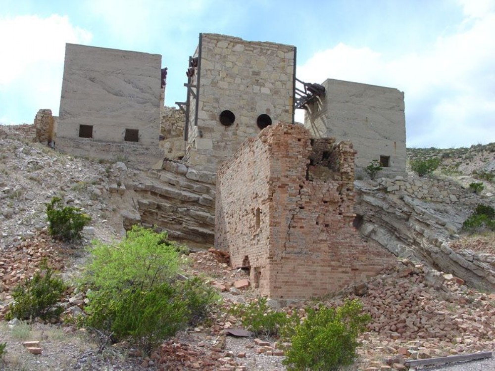 Ruins of the mercury ore processing facility at the Mariscal Mine in southern Big Bend National Park. Ore from the mine was heated in a kiln to about 350 degrees to drive off the mercury vapor. The mercury was then captured by large condensers in the upper structures. Warning signs indicate that the bricks in the ruin area still contain high levels of mercury.