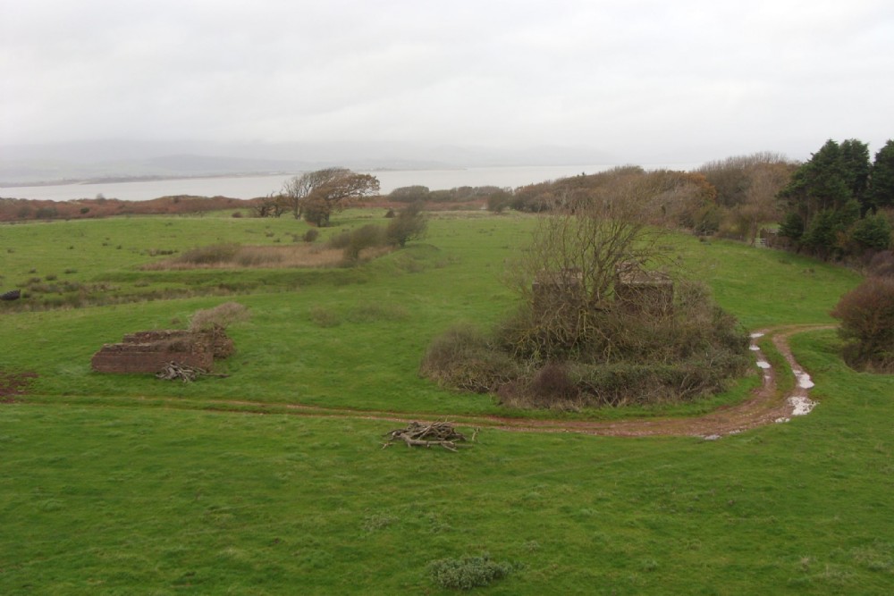 Taken from the top of the spoilheap, this shows a very solid pumping engine bed behind the trees. Brick winding engine bed on the left. Cooling pond in the background.