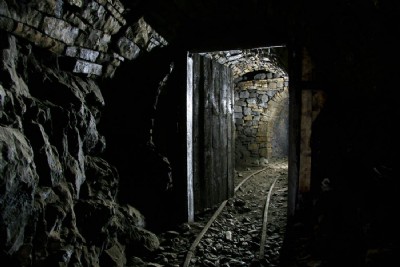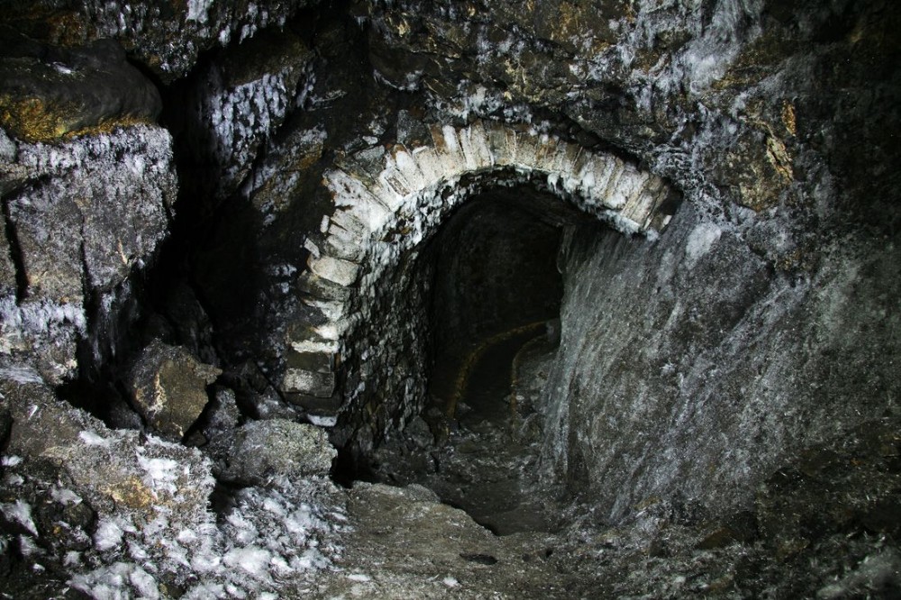 Tufts of epsomite crystals looking like snow on the walls of the level in Smallcleugh.
