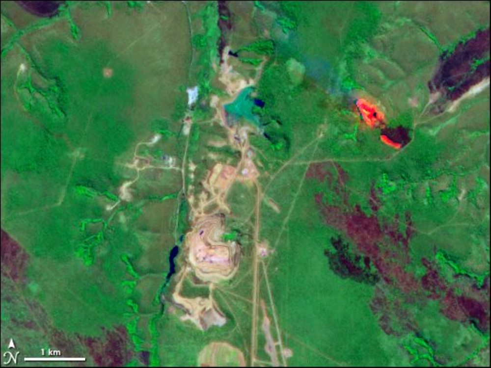 Satellite image of the mine from June 21st, 2001. the light red point in the north-east of the mine is a bush fire.