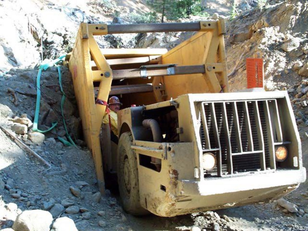 Scoop-tram and trench box protect the tunnel entrance from rockfalls. Workers in the tunnel shovel mercury-contaminated sediments into the scoop-tram bucket.