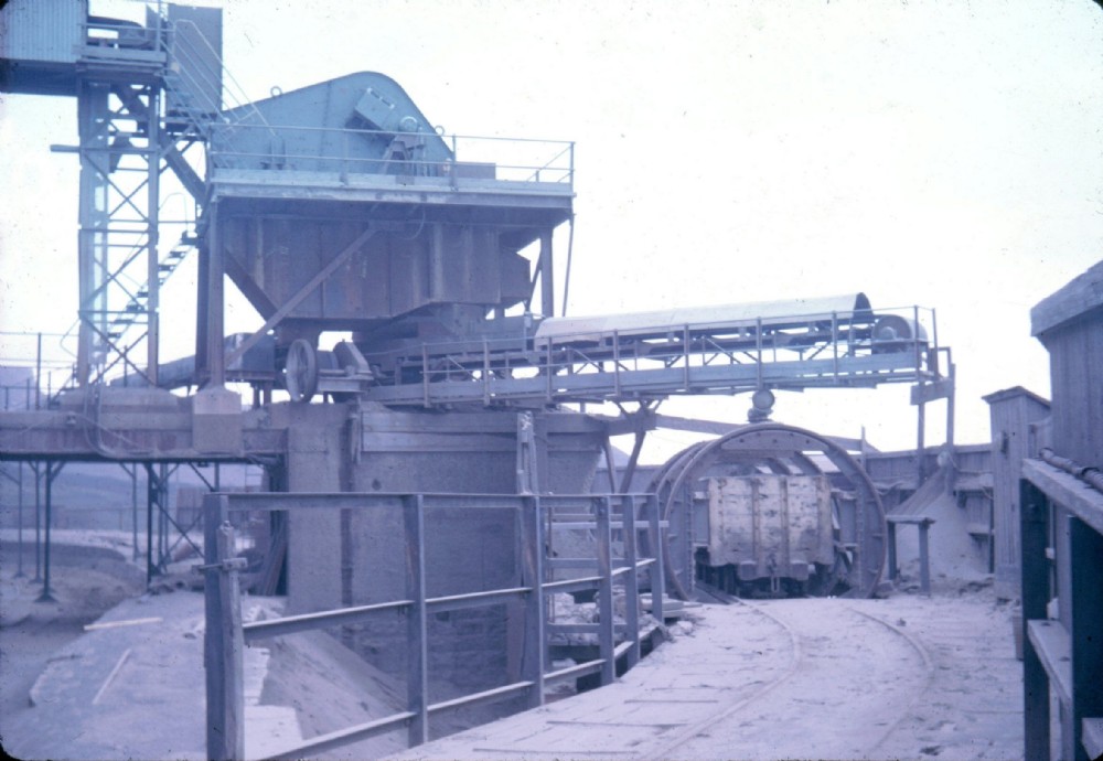 This was at the end of the 3ft gauge railway from Fox Bank primary mills. Out of use at the time, as large dumper lorries were carrying the rock from the primary to the secondary mill.