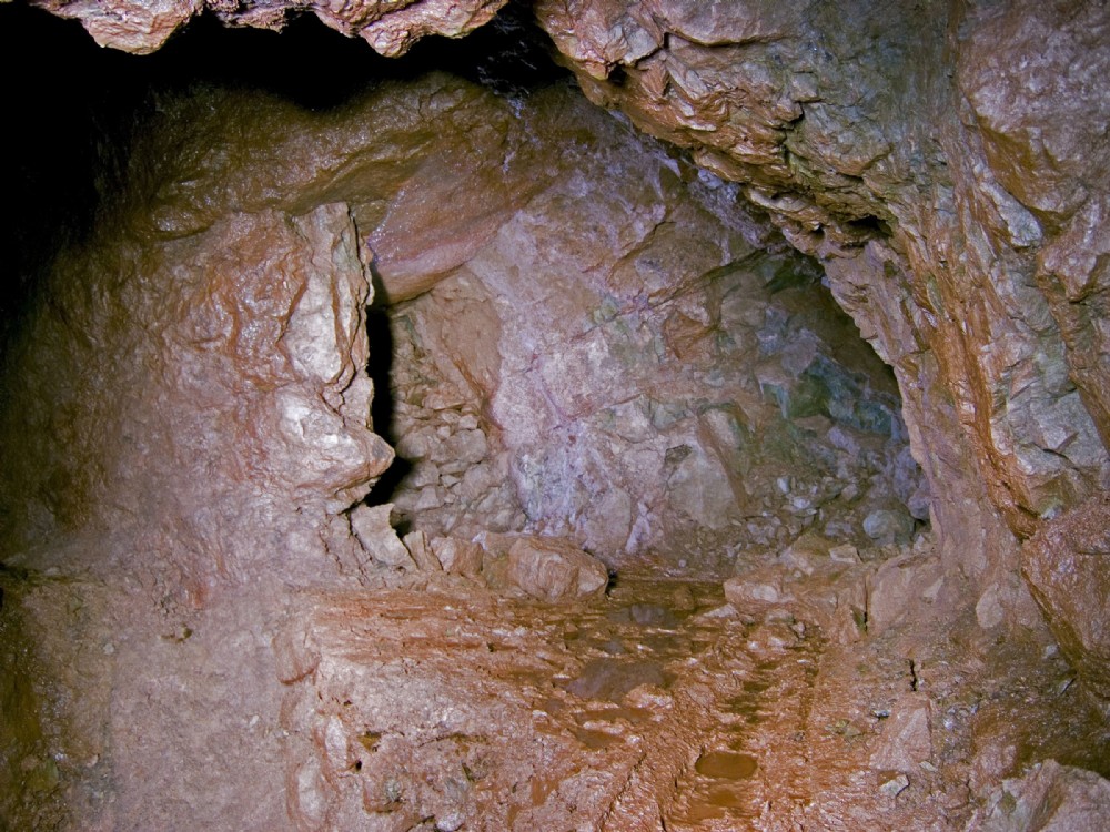 A poor photograph showing two converging passageways, an attempt to show the very narrow (~1') track gauge in the mine