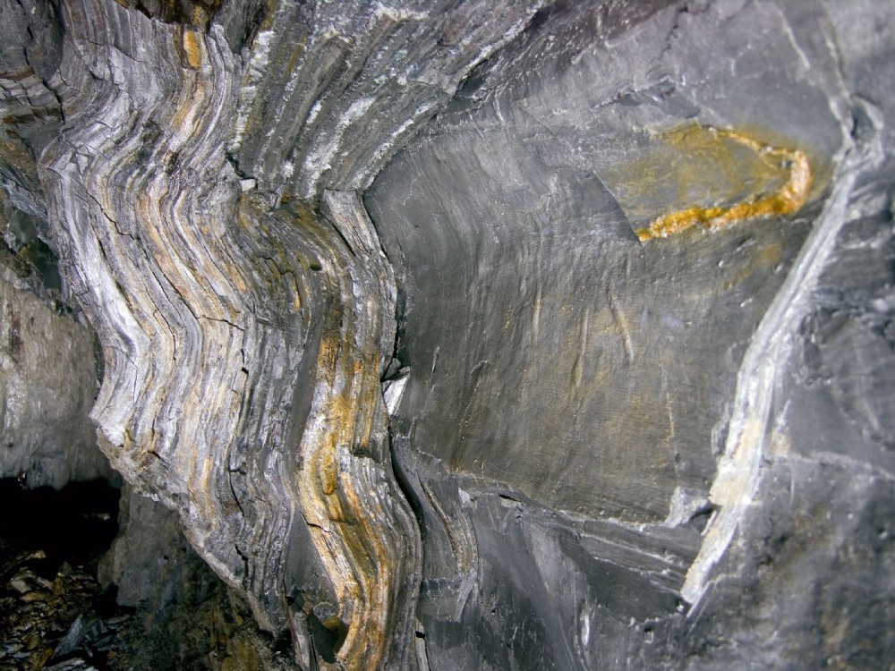 Close up view of an interesting sedimentary rock structure, also visible are what are possibly fosillised worms or other form of crawling vermicular life