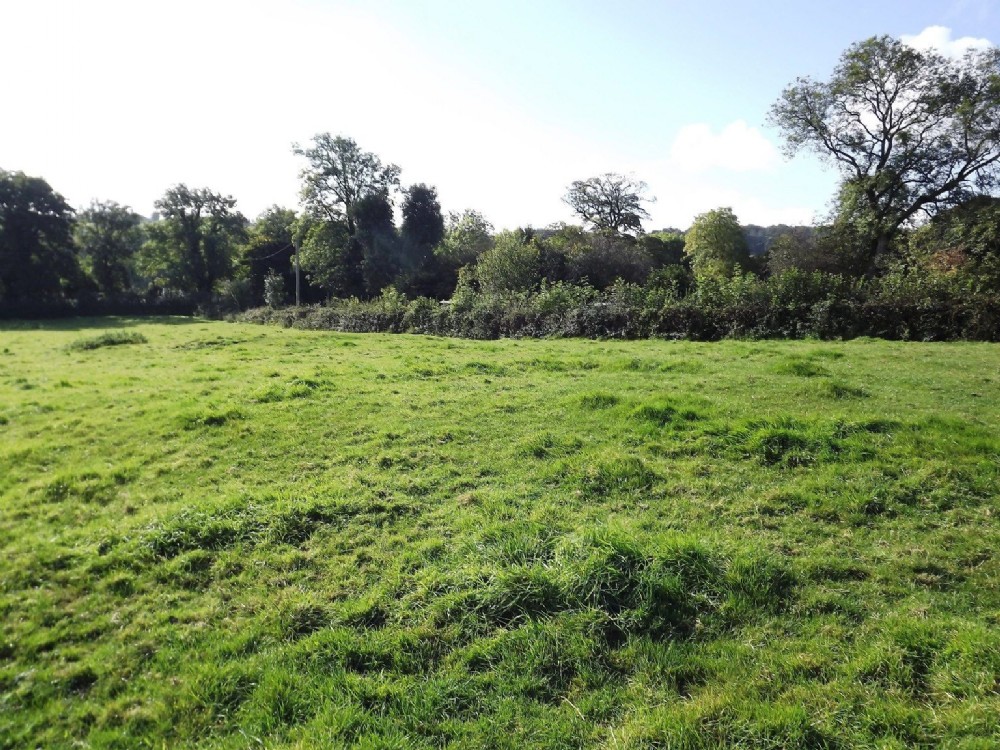 A shallow mounded area of a shaft (SK3139553645) with rough grass and the adit below (left of the photo)