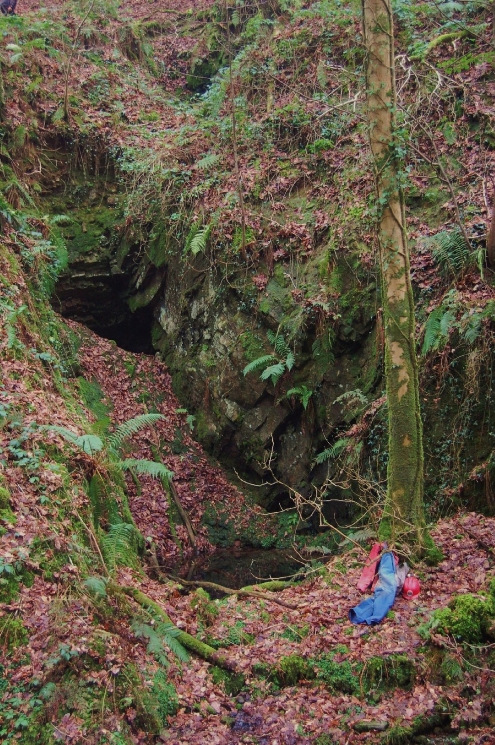The main flooded shaft next to the river with the level partially blocked behind. A rope as a hand line or to a harness is needed to get in. Dont go in through the window.