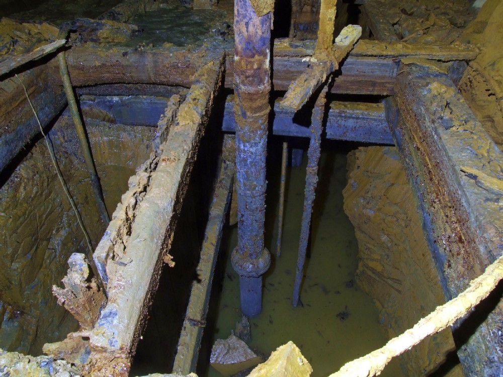 This picture shows the two compartments of the underground engine shaft. Left was for raising ore, right pumping and manway.