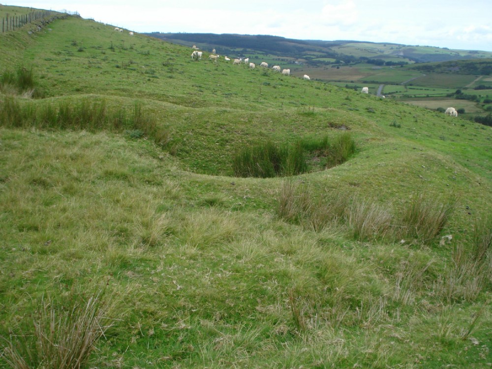 Old shaft near the fence at the crest of the ridge south of the waste tips. David Bick (The Old Metal Mines of Mid Wales part 1 page 36) thought this to be the water pressure engine shaft.