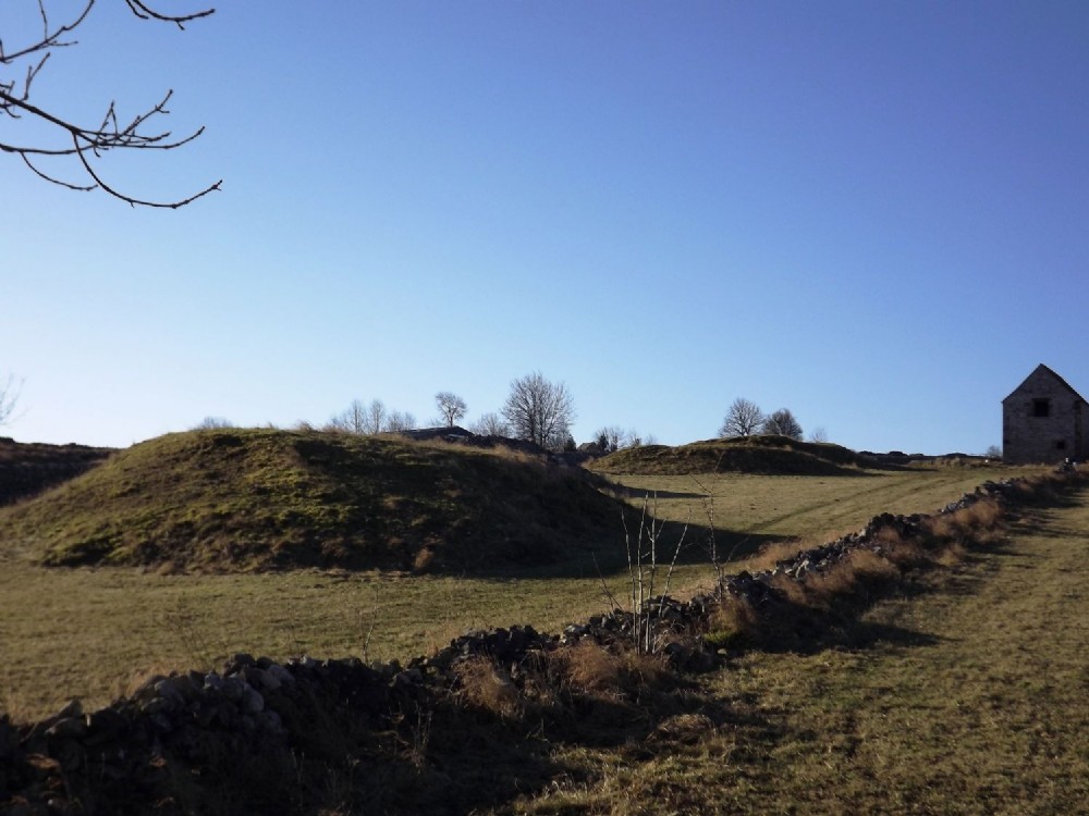 Some of the shaft mounds of Portobello Mines with Berkley Barn. Viewed from the path around Dene Quarry (December 2012)
