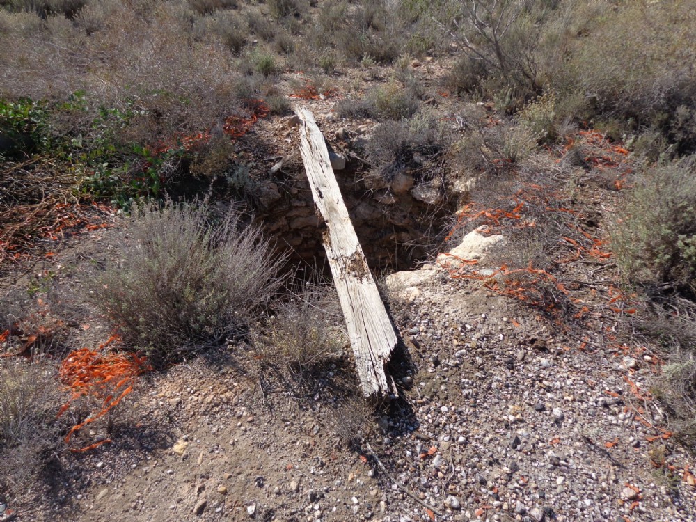 The top of an open shaft not far from the road. Health and safety measures appear to consist of scattering some orange netting on the ground round the shaft and putting an old beam across the top!