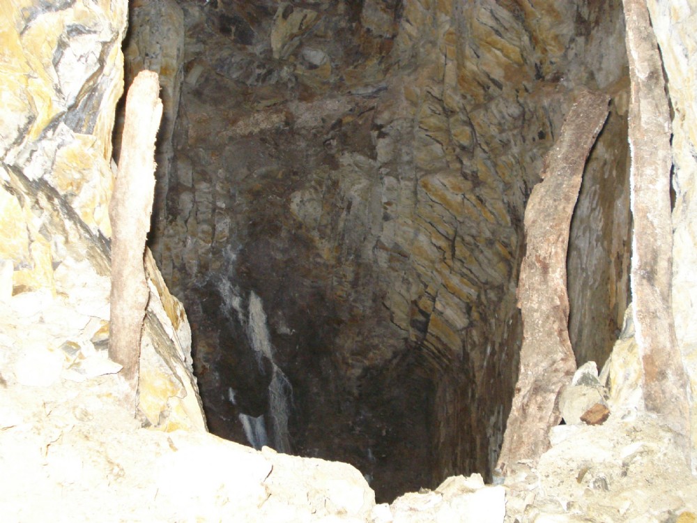 The shaft off to the side of the adit. As the fill in the opening off the adit was unstable I just stuck the camera over the top and hoped for the best. There is the sound of running water from lower down the shaft.