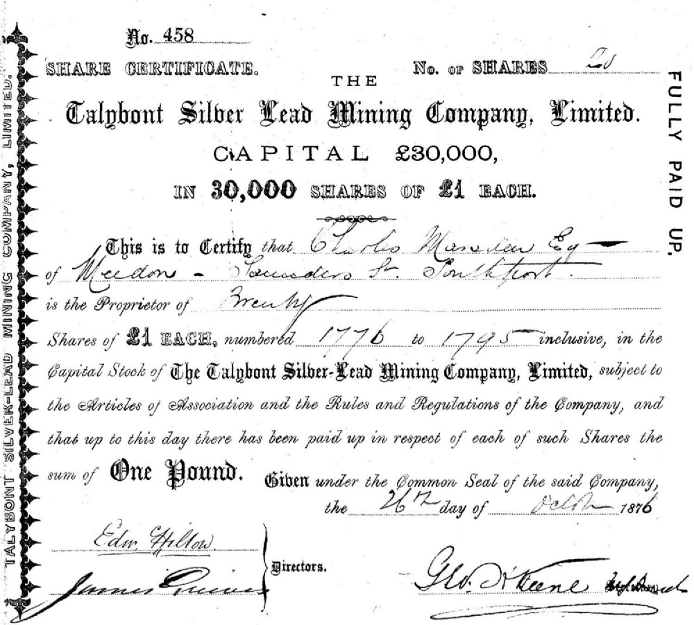 The Talybont Silver Lead Mining Company was formed to purchase the assets of the previous concern. The driving force behind this was undoubtably Joseph Fell who managed to attract investors from far afield as can be seen. Many of the duped investors were clergy!