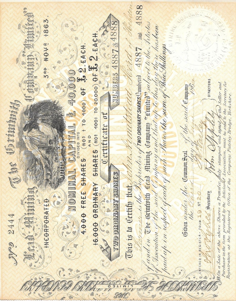 Scan of a share certificate No 4887 and 4888 3rd November 1863 at £2 each share. Embossed seal in bottom RH corner.