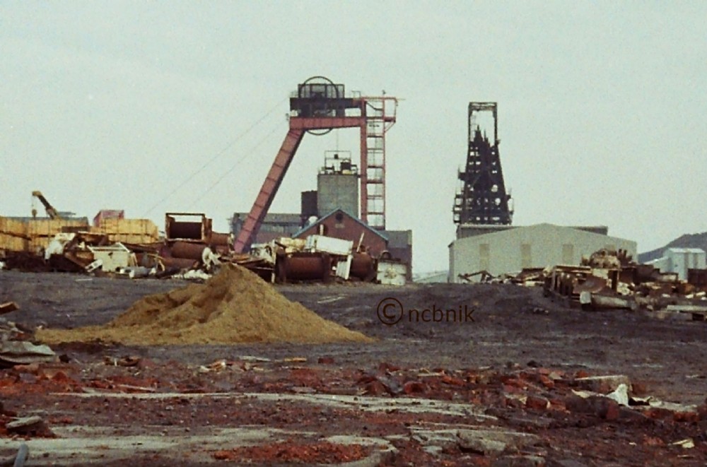 Almost finished: nearly everything gone apart from headgears, winders and the grey 'wendy house' to the right, which I can't remember what it housed; at first I thought it was the 'new' boiler house but, thinking about it, I think this was smaller & at right angles. So, if you can remember better than me, please let me know and I'll amend this entry.
