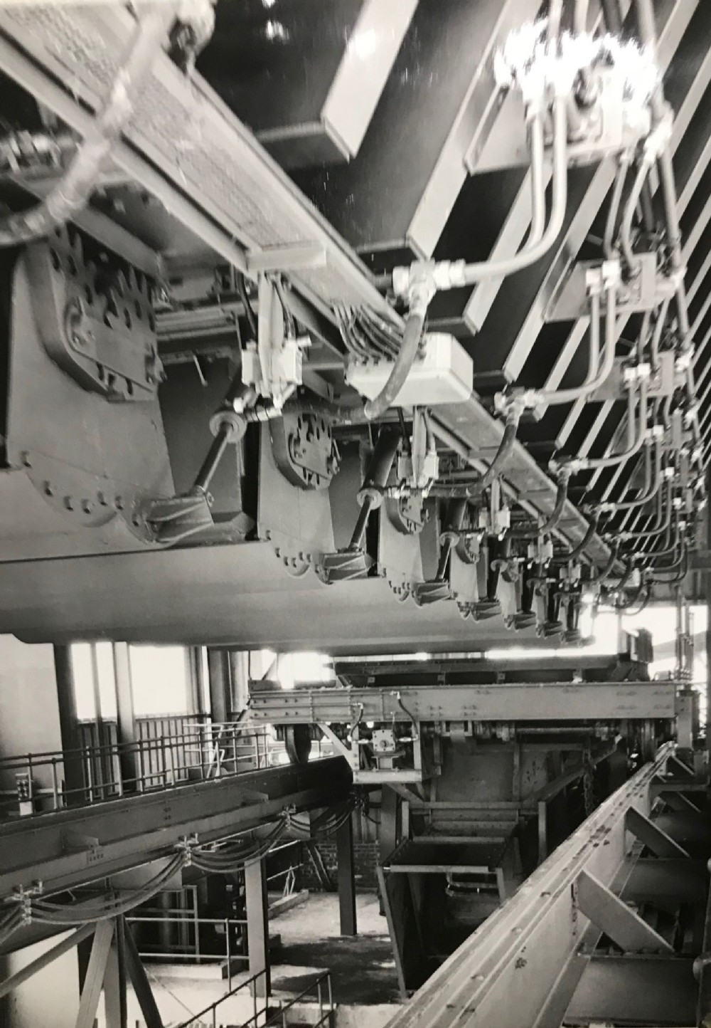Rapid loading plant showing underside of storage bunkers with pneumatically operated radial doors. The travelling loading chute can be seen in the parking bay in the bottom right hand corner of the photographs.