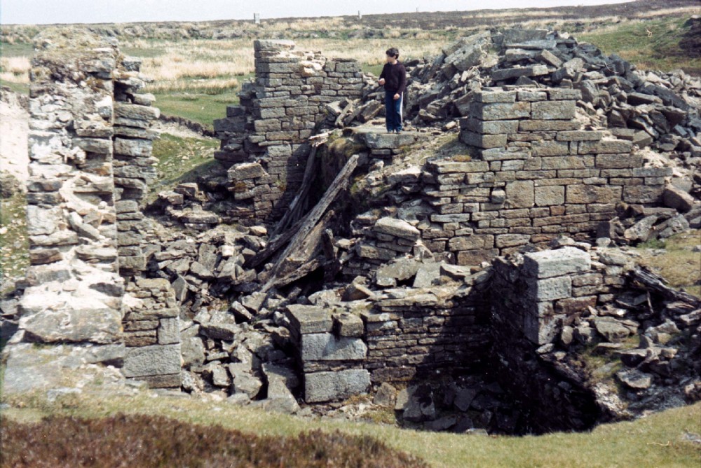 The figure is standing on the stone base which supported the vertical cylinder of the beam engine, probably Cornish. Collapsed shaft and bob wall to left. Coal store in foreground. Single boiler site in front of tall wall to right.