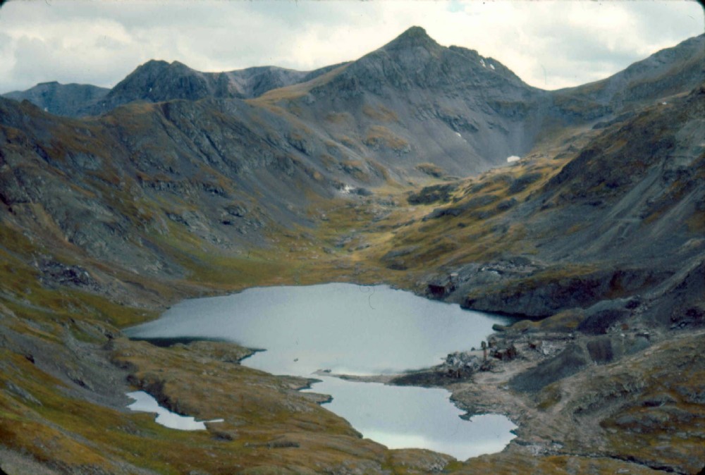 Silver lake with Silver Lake Mine closest on right, Iowa Mine further back on right, and Royal Tiger Mine across lake from Iowa Mine. Photo Sept 1976, from slopes below summit of Little Giant Peak. Lake elev. 12,186 ft.