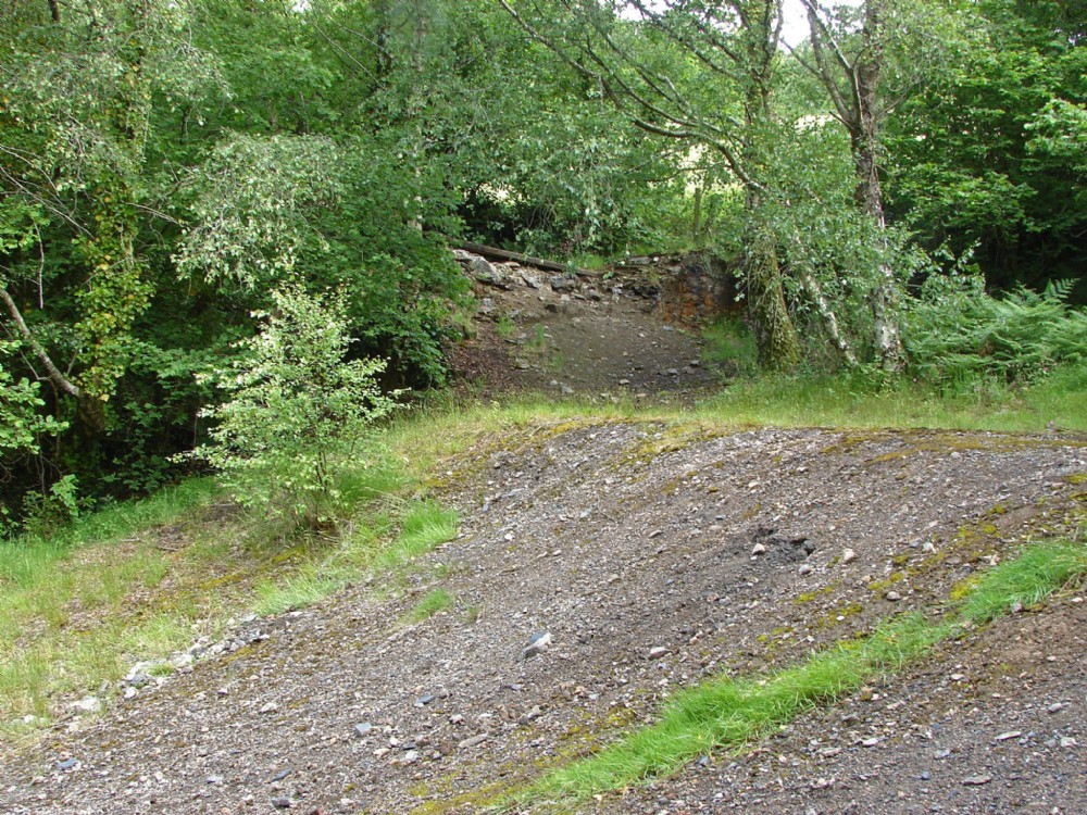 The base of the old crusher house at Silverbrook Mine. This once contained a rock crusher driven by a 20 inch steam engine installed in a house to the left of the crusher. This engine also doubled as a winding engine for the main shaft which was situated in the area of shadow by the tree trunk on the left of the photograph. The crusher was fed from above and there was a rail incline supported by large poles which the ore wagons would be pulled up, presumably by a winch at the top of the crusher house. The base of one of the poles can still be seen near the stream. The sketches of the mine by Frederick Foote, a local artist, show this incline in good detail.
