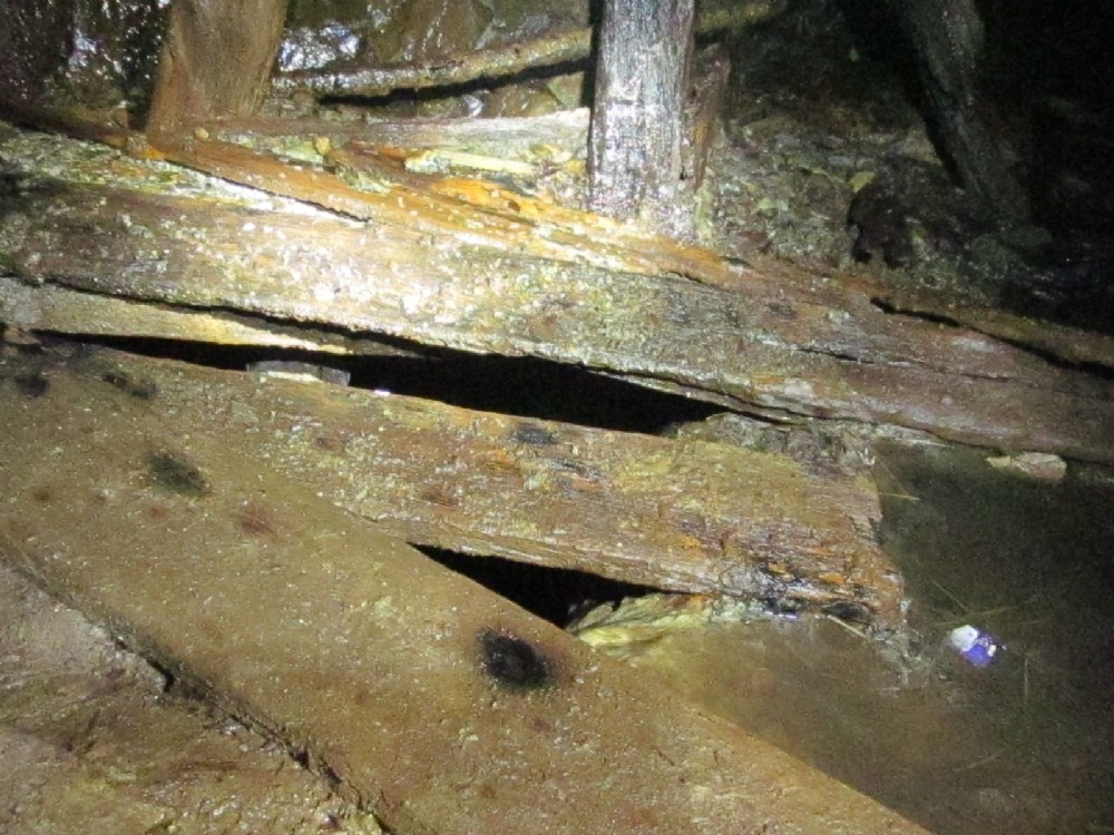 Scattered planks on the false floor.
