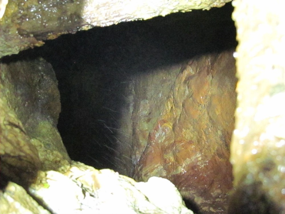 Looking down the stope through some rather dodgy false flooring, to the water level of flooded workings.