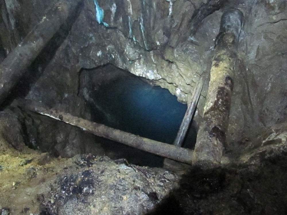 Parallel shaft flooded next to the planked stope, off the main adit.