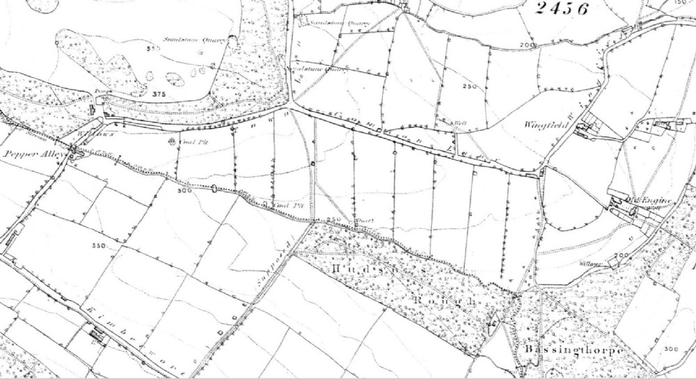 The map shows the site of Greasbrough Colliery labelled Pepper Alley where the Sellars brothers sunk pits in the early 1850s. The map also shows Old Engine to the east, and the building to the north of that is labelled Lower Engine on later maps.
