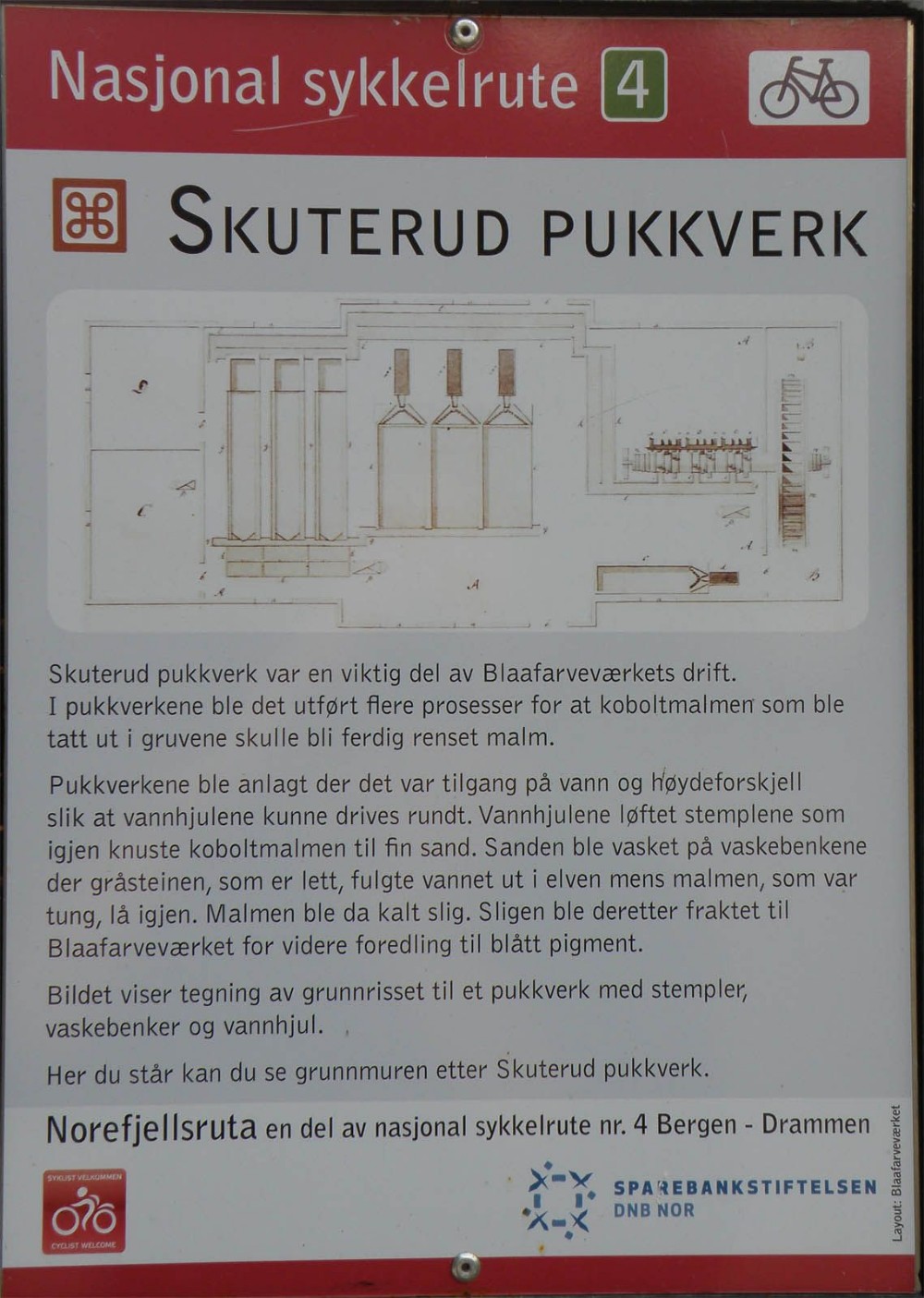 Skuterud battery was an important part of the Blaafarvevaerkets operation. The treatment works carried out several processes so that cobalt ore which was taken out of the mines should be fully cleaned ore. Treatment plants were built where there was access to water and a drop in elevation so that water wheels could be driven. The water wheels lifted pistons which broke the cobalt ore to fine sand. The sand was washed in washing benches where rock, which is light, came out in the flow into the river while the ore, which was heavy, was left behind. The ore was then called Slig. Slig was then transported to Blaafarveværket for further processing to blue pigment. The picture shows a drawing of the ground plan of a battery with stamps, washing benches and water wheels. Here you can see the foundations of Skuterud battery.