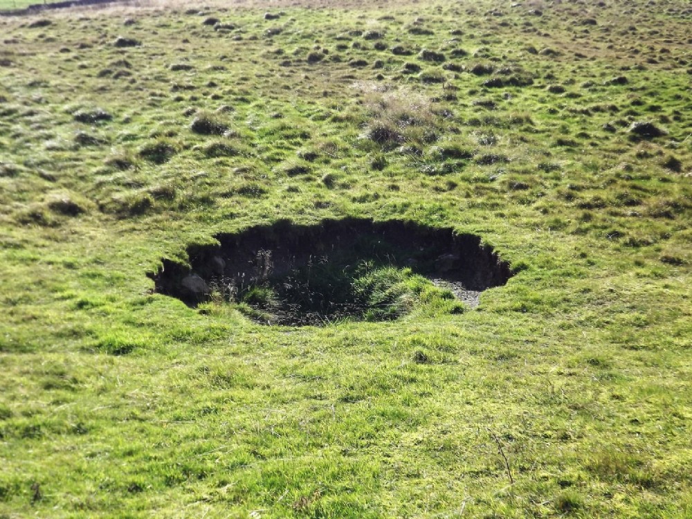 This small circular collapse is next to the square concrete capped shaft. It looks fairly recent and could be a second shaft - possibly climbing shaft. Oct 2011