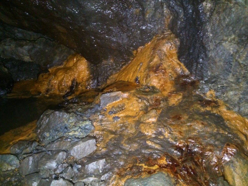 Small dam covered in formations at the end of the level, past the shaft and adjacent to the stope collapse.
